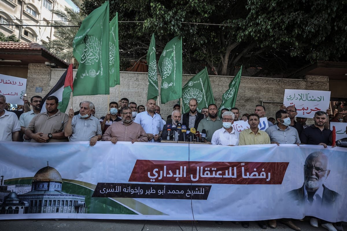Mohammed al-Ghul (C), uno dei dirigenti di Hamas, fa un discorso durante una protesta contro la politica israeliana di detenzione amministrativa di fronte all’edificio del Comitato Internazionale della Croce Rossa (CICR) a Gaza City, Gaza, il 12 luglio 2021 [ Ali Jadallah/Agenzia Anadolu]