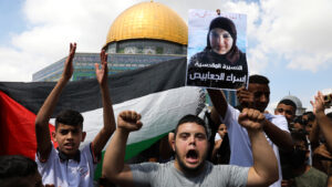 Foto caratteristica | I manifestanti tengono una bandiera palestinese e un cartello del la prigioniera Israa Jaabis, che soffre di gravi ustioni e sta combattendo per cure mediche, durante una protesta a sostegno dei prigionieri palestinesi presso la Moschea Cupola della Roccia nel complesso della Moschea di Al Aqsa nel Vecchio Città di Gerusalemme, 10 settembre 2021. Mahmoud Illean | AP
