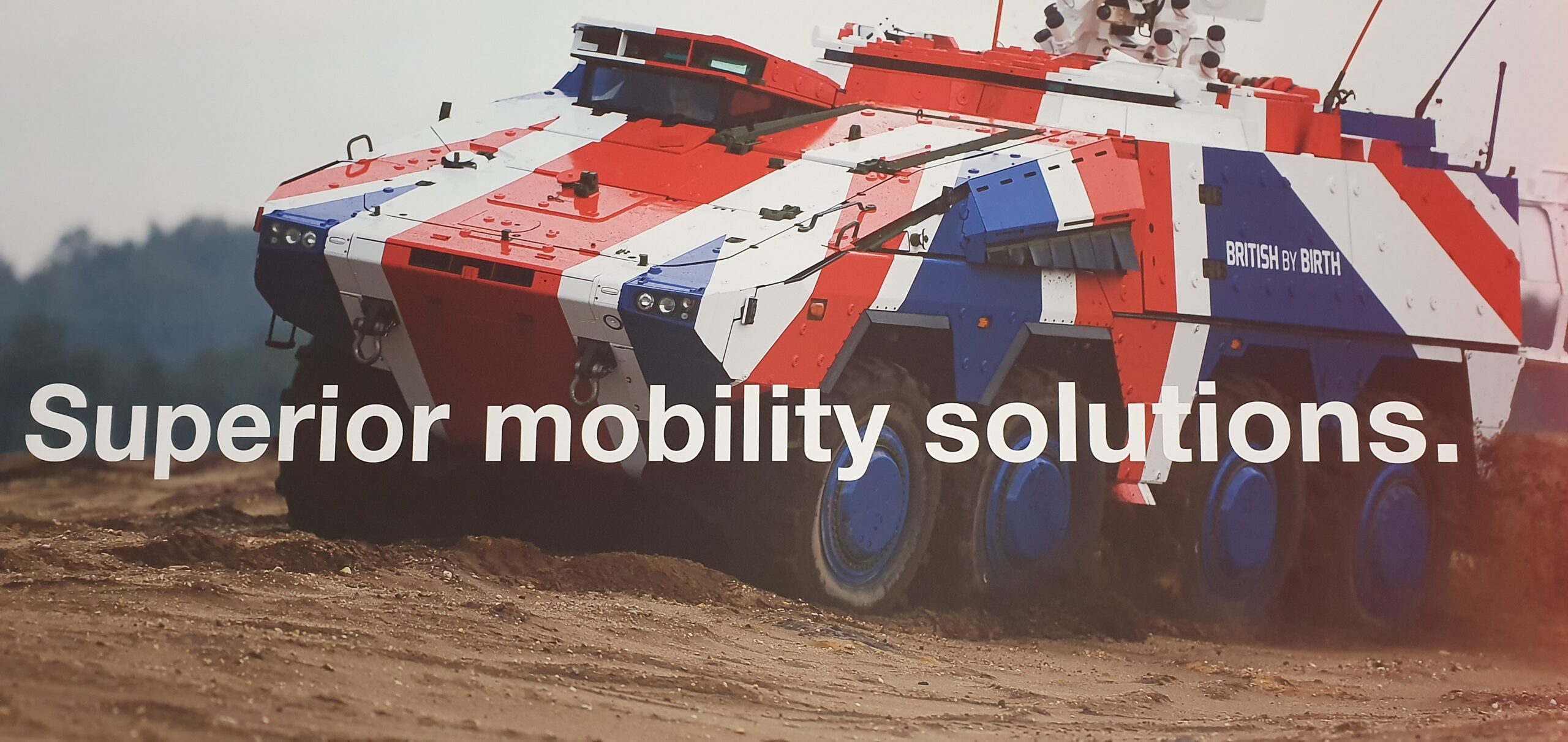 In un altro stand, una foto mostrava un veicolo blindato con i colori dell’union jack. Diceva: “British by Birth”/”Britannico di nascita”.