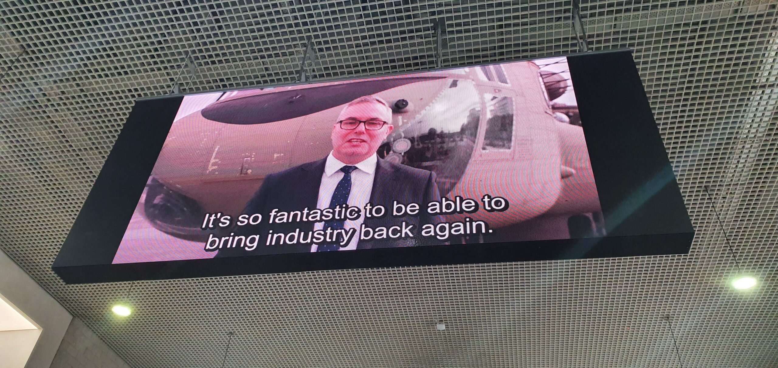 I partecipanti sono accolti da un video riprodotto su un grande schermo appeso al soffitto, il 14 settembre 2021 (MEE/Frank Andrews)
