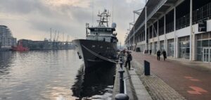 Una nave battente bandiera belga ormeggiata sul Tamigi vicino al centro conferenze, il 14 settembre 2021 (MEE/Frank Andrews)