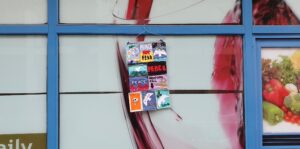 Un cartello dei protestanti è rimasto appeso fuori da un negozio vicino al centro Excel (MEE/Frank Andrews)