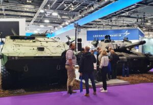 Dietro ogni angolo nel labirinto di bancarelle – molte delle quali torreggiavano in alto persino sopra i più grandi camion verdi mimetici, in un’impresa di (costosa) logistica – brillavano droni, elicotteri e carri armati, accanto a slogan eufemistici come “soluzioni di mobilità superiore” e “acciaio per armature dall’orgoglioso retaggio”.