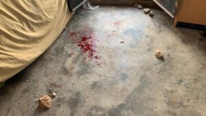 Macchie di sangue sul pavimento di una casa nel villaggio palestinese di Mufaghara nelle colline del sud di Hebron dopo che 60 coloni mascherati hanno attaccato persone, case e automobili, 28 settembre 2021. (Alliance for Human Rights)