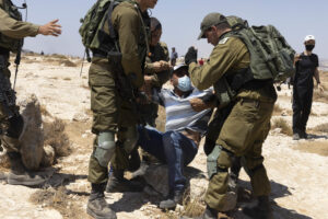I soldati israeliani arrestano un manifestante durante una manifestazione contro gli insediamenti nelle colline a sud di Hebron nell’agosto 2021. Oren Ziv ActiveStills