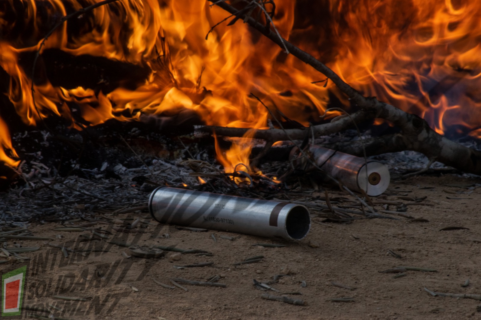 Dopo la preghiera della comunità di Beita recitata sotto gli alberi, abbiamo iniziato la marcia con le bandiere lungo il sentiero verso l’avanposto*, ma – come prassi – sono arrivati i soldati: ai gas, bombe sonore, proiettili di gomma, di acciaio foderato di sottile gomma e di acciaio… e basta, i giovani rispondono lanciando pietre con le fionde fatte da loro e, quando il vento soffia verso l’avanposto, bruciando copertoni.