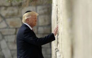 L’ex presidente degli Stati Uniti Donald Trump visita il muro del Buraq, il 22 maggio 2017, a Gerusalemme. (Foto AP/Evan Vucci)