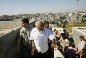 Il 28 maggio 2008 il premio Nobel per la pace Desmond Tutu (C) visita una casa nella città di Beit Hanun, nel nord della Striscia di Gaza. [MOHAMMED ABED/AFP via Getty Images]