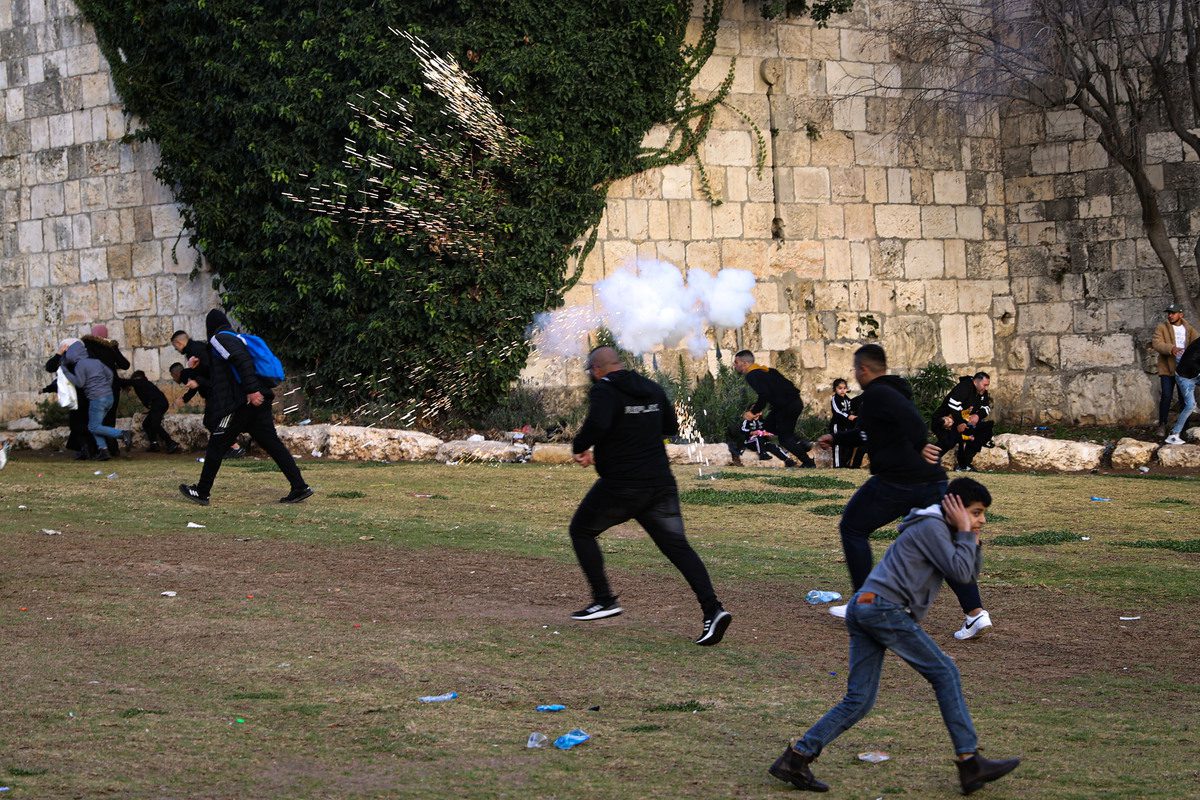 Le forze israeliane intervengono sui palestinesi mentre si stavano radunando per celebrare Lailat al Miraj vicino al complesso di Masjid al-Aqsa a Gerusalemme il 28 febbraio 2022. [Mostafa Alkharouf – Agenzia Anadolu]