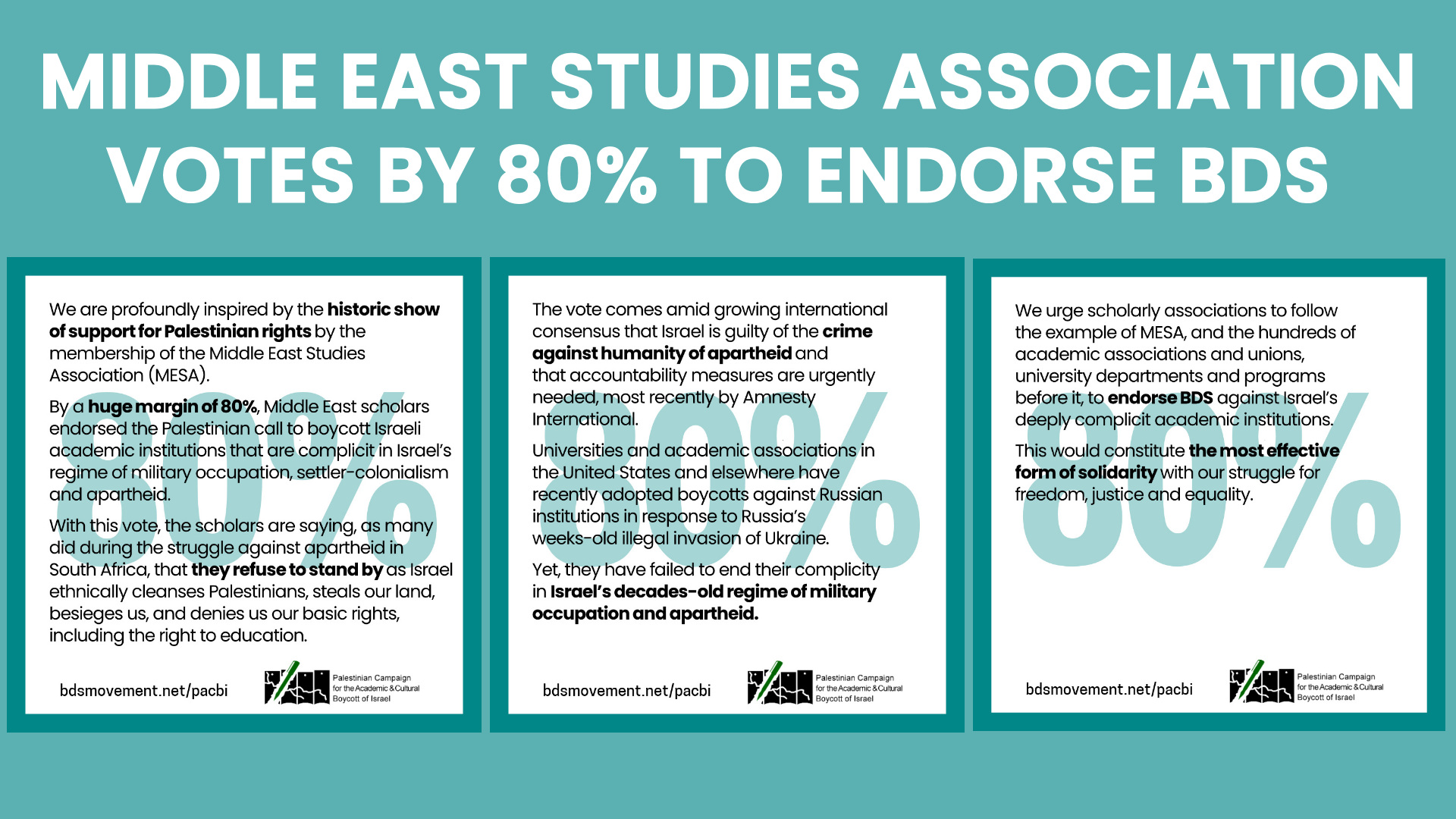 La campagna palestinese per il boicottaggio accademico e culturale di Israele (PACBI) è profondamente ispirata dalla storica dimostrazione di sostegno ai diritti dei palestinesi da parte della Middle East Studies Association (MESA).