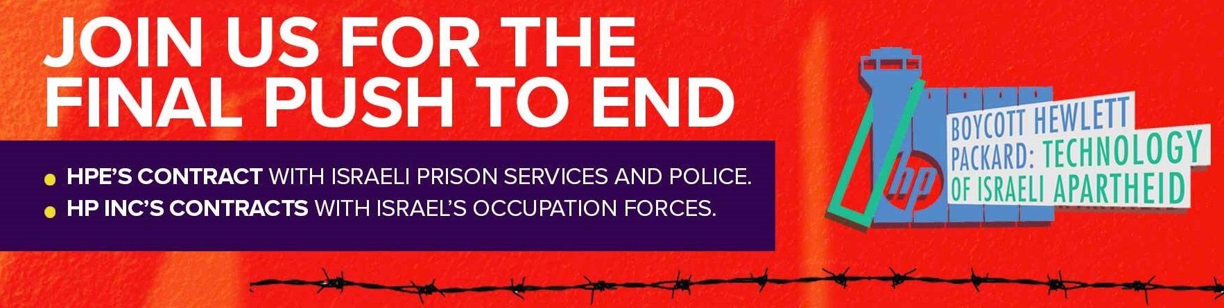 HPE continua a fornire servizi alle carceri e alla polizia israeliane nonostante la piena conoscenza delle gravi violazioni dei diritti umani perpetrate da entrambe. Ciò significa che HP rimane complice dell’apartheid. Unisciti a noi per la spinta finale mentre intensifichiamo la nostra campagna di solidarietà con i detenuti amministrativi palestinesi e altri prigionieri politici, per porre fine ai restanti contratti tra le società a marchio HP e Israele stato di apartheid.