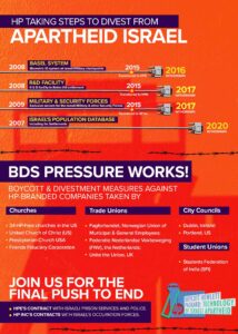 La campagna per boicottare HP è stata lanciata per porre fine a questa complicità e continua a crescere forte. Ha un’ampia gamma di sostegno da consigli comunali, sindacati, chiese, sindacati studenteschi e ampie organizzazioni della società civile. In oltre un decennio di campagne, molti contratti tra le società a marchio HP e Israele dell’apartheid sono scaduti, dimostrando che la pressione del BDS funziona. Ciò include i contratti con la Marina israeliana che mantiene l’assedio di Gaza, il contratto del sistema di Basilea per l’identificazione biometrica utilizzato ai posti di blocco militari israeliani e, più recentemente, il contratto del sistema Aviv tra HPE e l’Autorità israeliana per la popolazione e l’immigrazione. Fornendo server esclusivi per la manutenzione del database della popolazione israeliana, incluso il database Yesha degli insediamenti illegali, HPE è stata complice nel mantenimento di un pilastro dell’apartheid israeliano. Questo contratto è stato ora gradualmente ritirato.