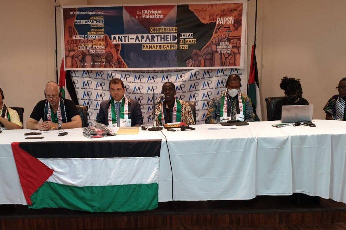 Da sinistra a destra: Saleh Hijazi, capo di Amnesty International Palestine, Jamal Juma’, capo della campagna Stop The Wall e membro fondatore del movimento BDS, Safwat Ibraghith, ambasciatore palestinese in Senegal, Madieye Mbodj, presidente del comitato senagalese di solidarietà per la Palestina; Nkosi Zwelivelile Mandela (parlamentare sudafricano e nipote di Nelson Mandela), Roshan Dadoo – Coalizione BDS sudafricana, Emma Nyerere, Organizzazione Panafricana delle Donne [PAPSN]