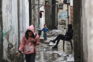 Palestinesi su una strada stretta in condizioni difficili nel campo profughi di Jabalia, a Gaza City, Gaza, il 17 dicembre 2020. [Ali Jadallah – Agenzia Anadolu]