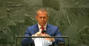 Gilad Erdan, ambasciatore di Israele presso le Nazioni Unite, strappa un rapporto del Consiglio per i diritti umani delle Nazioni Unite il 29 ottobre 2021 (Twitter/@giladerdan1)