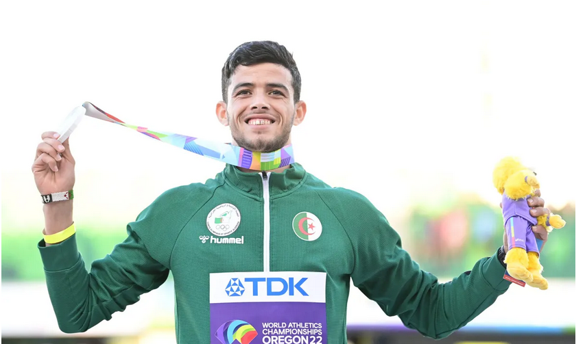 Il vincitore della medaglia d’argento Djamel Sedjati del Team Algeria posa durante la premiazione per la finale degli 800 m maschili il nono giorno dei Campionati mondiali di atletica leggera Oregon22 a Hayward Field il 23 luglio 2022 [Hannah Peters/Getty Images for World Athletics]