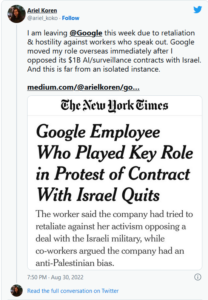 https://www.aljazeera.com/news/2022/9/1/google-employee-resigns-in-protest-over-israel-contract?fbclid=IwAR1BLpCV8baAqNZkQrrf3wUgYwHEdpy2uf-BIixXb-tqFg3v_jTy12UCNIU&sf169940940=1