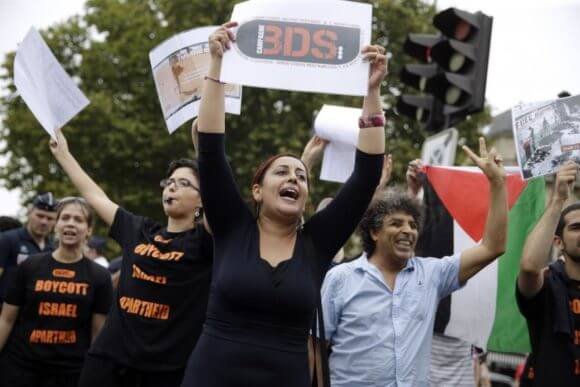 Manifestante tengono cartelli a sostegno del BDS, il movimento per il boicottaggio, il disinvestimento e le sanzioni contro Israele, a “Tel Aviv sur Seine” a Parigi, 13 agosto 2015. (Foto: Kenzo Tribouillard/AFP/Getty Images)