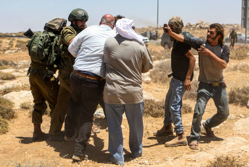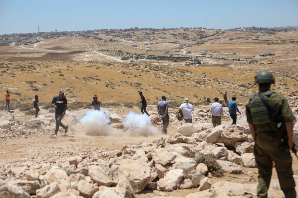 Attivisti palestinesi vengono dispersi dopo una colluttazione con i soldati israeliani e i coloni ebrei durante una protesta contro la decisione dell’alta corte di espellere 8 comunità palestinesi da Masafer Yatta, nelle colline a sud di Hebron, 10 giugno 2022 (foto: Mamoun Wazwaz/APA images)