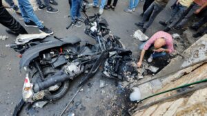 Un uomo ispeziona una motocicletta danneggiata sulla scena in cui Tamer Kilani, membro palestinese di Lion’s Den, è stato ucciso in un’esplosione a Nablus il 23 ottobre (Reuters)