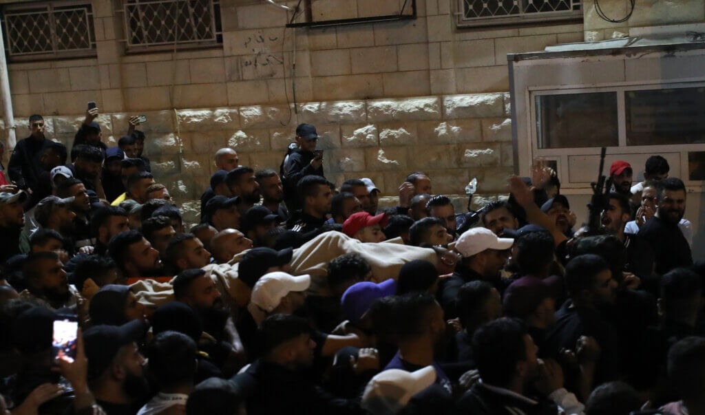 Palestinesi si radunano fuori dell’ospedale di Nablus in seguito all’uccisione di 5 Palestinesi durante un raid israeliano a Nablus il 25 ottobre (foto Str/apa)