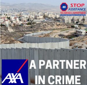 La società civile palestinese chiede da tempo ad AXA di attuare una coerente politica di investimento responsabile e porre fine alla sua complicità nelle violazioni dei diritti umani dei palestinesi da parte di Israele dell’apartheid e nella distruzione del clima. Finanziando le banche israeliane che sono la spina dorsale dell’impresa degli insediamenti illegali israeliani, AXA è responsabile – e possibilmente legalmente responsabile – di favoreggiamento o profitto da crimini di guerra e crimini contro l’umanità dell’apartheid.