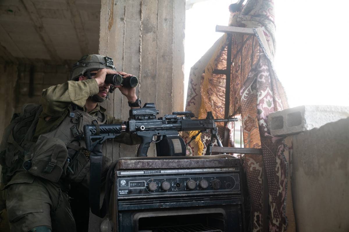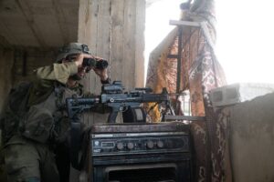 Un soldato israeliano ispeziona l’area dalla copertura durante un raid israeliano a Jenin [Forze di difesa israeliane (IDF)]