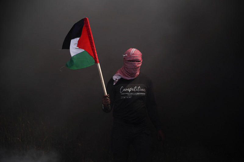 Una persona con il volto coperto emerge dal fumo scuro con la bandiera palestinese