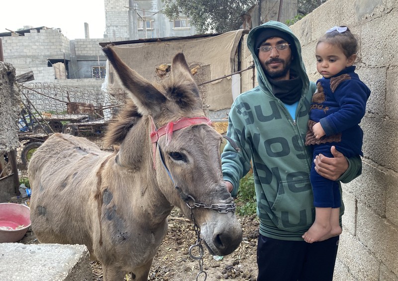 Abdullah al-Siksik, 27 anni, posa con sua figlia e il suo asino nel campo profughi di Jabaliya a Gaza. Anche se si è laureato in inglese, lavora come raccoglitore di rifiuti a Gaza.