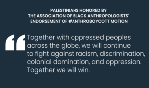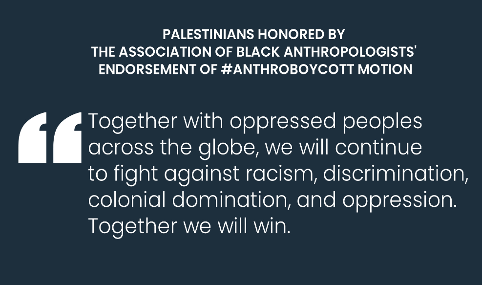 La Federazione palestinese dei sindacati di professori e dipendenti universitari (PFUUPE) e la Campagna palestinese per il boicottaggio accademico e culturale di Israele (PACBI) sono onorate di avere l’Associazione degli antropologi neri (ABA) al nostro fianco nella lotta universale per la libertà, giustizia e uguaglianza.
