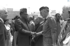 Il presidente Mobutu Sese Seko dello Zaire stringe la mano al capo di stato maggiore dell’IDF Moshe Levy all’aeroporto Ben-Gurion, 12 maggio 2985. (Nati Harnik/GPO)