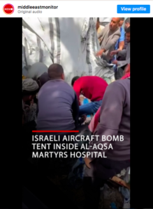 Aerei militari israeliani hanno bombardato una tenda che ospitava palestinesi sfollati all’interno dell’ospedale dei martiri di Al-Aqsa, nel centro della Striscia di Gaza assediata. Attivisti locali riferiscono che decine di palestinesi all’interno o nei pressi della tenda sono stati uccisi o feriti.