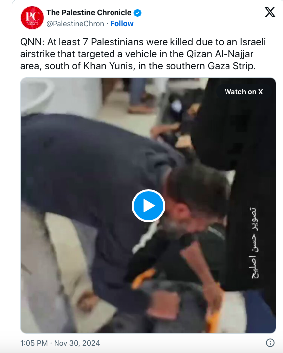 Il Palestinian Information Center ha anche riferito di sette morti a seguito di un bombardamento israeliano che ha colpito un veicolo e un gruppo di civili che raccoglievano farina nella zona di Qizan Al-Najjar, a sud di Khan Yunis.
