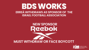 In seguito alle richieste di boicottaggio, l’azienda italiana di abbigliamento sportivo si è ritirata da un contratto di sponsorizzazione con la Israel Football Association. I palestinesi esortano il nuovo sponsor Reebok a ritirarsi o ad affrontare boicottaggi, come Erreà, PUMA e Adidas prima di loro.