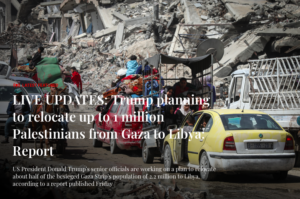 Secondo un rapporto pubblicato venerdì, Anadolu riporta che gli alti funzionari del presidente degli Stati Uniti Donald Trump stanno lavorando a un piano per trasferire in Libia circa la metà della popolazione di 2,2 milioni di persone della Striscia di Gaza sotto assedio.