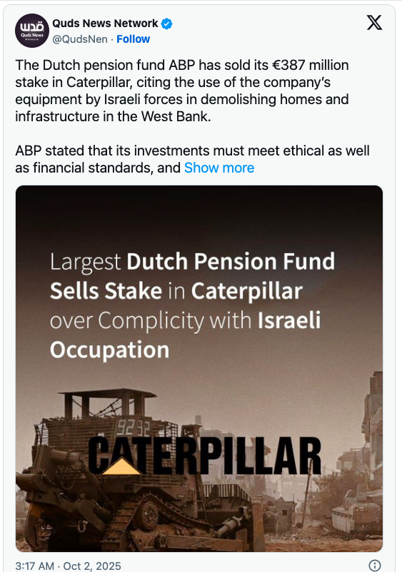 Il più grande fondo pensione dei Paesi Bassi, ABP, ha annunciato di aver venduto le sue azioni Caterpillar, a causa del presunto coinvolgimento del produttore americano di attrezzature nella fornitura all’esercito israeliano, ha riportato l’agenzia di stampa Anadolu.